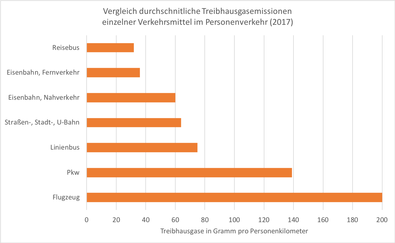 Warum sind alle mit dem Zug angereist? Auch wenn sich im Rahmen eines Klimaschutz-Projektes vielleicht weniger die Frage stellt, ob man lieber fliegen sollte, macht hier ein direkter Vergleich von verschiedenen Verkehrsmitteln auf den ersten Blick deutlich, warum wir uns für die Anreise mit der Bahn entschieden haben. (Der Reisebus hat im Vergleich die beste Klimabilanz, allerdings ist das Streckennetz noch nicht so dicht wie das der Bahn).