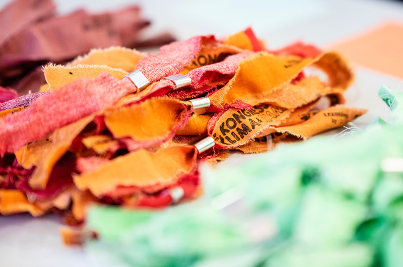 Die Kongressbändchen wurden aus alter Bettwäsche und anderen Second Hand-Stoffen zugeschnitten. Den Aufdruck haben wir selbst gestempelt. Mit einem Stempel aus Naturkautschuk (umweltfreundlichere Alternative zu Standardgummi bzw. Fotopolymeren) von einem Betrieb nahe Berlin.