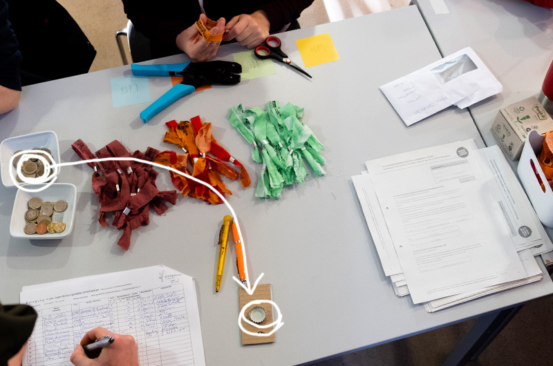 Wir möchten Ressourcen schonen und den CO2-Ausstoß, der bei Transport und Produktion entsteht, einsparen. Also haben wir selbst Hand angelegt und die Ausweise gebastelt. Kronkorken und Pappe wurde wiederverwendet und die Aufkleber haben wir auf recyceltem Papier in unserem Büro gedruckt. Der Clou: Das Schild wurde mit einem Kronkorken auf der einen Seite und einer 2-Euro-Münze auf der anderen Seite an einem T-Shirt befestigt. Ein weiterer Vorteil: die Namensfelder wurden für die Teilnehmenden frei gelassen. So konnte jede*r sich so nennen, wie er*sie es wollte. Und wenn eins verloren gegangen ist, konnten wir ohne Probleme ein neues Namensschild erstellen…