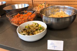 Womit wir bei der Frage wären, warum wir uns um das Essen überhaupt Gedanken gemacht haben: Indem wir vegetarische/vegane Optionen angeboten haben und gleichzeitig viel Wert auf biologischen und regionalen Anbau gelegt haben, haben wir die Verpflegung möglichst klimafreundlich gestaltet.
