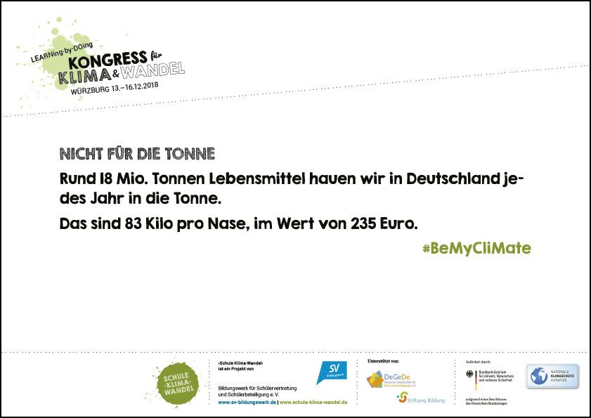Wie wär´s, wenn du mit deinen Freund*innen in der Schule ein paar leicht zu merkende Klimafakten aufhängst? Schaut euch um, welche Orte und Themen zusammen passen, recherchiert ein paar Zahlen und Vergleiche und dann legt los mit Malen, Schreiben, Ausdrucken, Aufkleben/Aufhängen – natürlich nur mit Recyclingpapier! Je abgefahrener die Info, desto eingängiger :-)