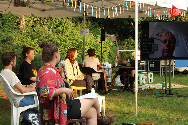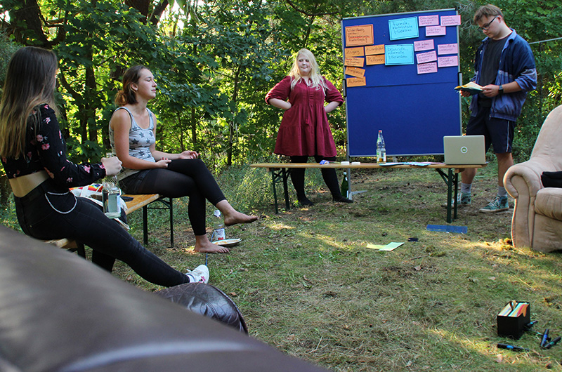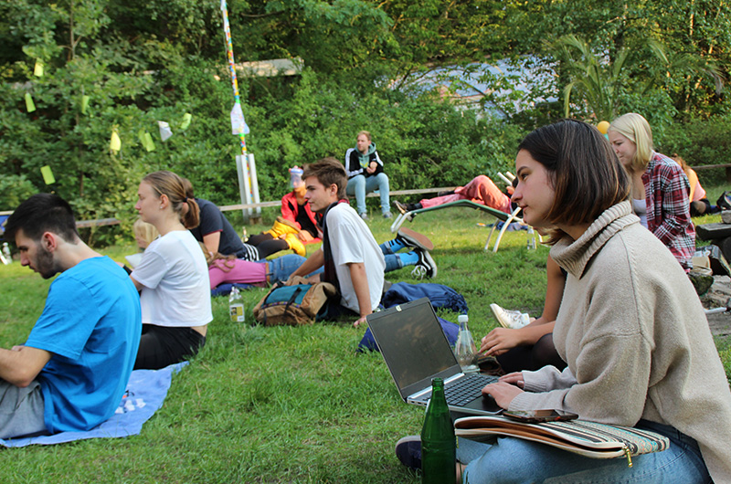 Bei angenehmer Spätsommersonne gab es viele Angebote wie Siebdruck, Kanufahren und Programmieren für Anfänger*innen – natürlich unter Einhaltung von Abständen und Maskenpflicht! Wir haben viel diskutiert und uns ausgetauscht. In Kleingruppen wurden verschiedenste Themen wie »Wie umgehen mit Konservatismus im Elternhaus?«, »Was kann ich gegen die Klimakrise tun?«, »Hierarchien?! Gibt´s doch gar nicht« oder »In welchem Alter muss Demokratiebildung beginnen?« besprochen. Diskutiert wurde aber nicht nur vom Netzwerk, sondern auch Freitagabend bei einer Podiumsdiskussion zum Thema »Klimawandel stoppen – (wie) geht das überhaupt noch?« mit verschiedenen Gästen.