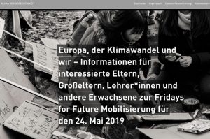 Trotzdem hat es uns sehr gefreut, als unser Projekt auf dem Blog Klima-der-Gerechtigkeit zur Fridays for Future-Demonstration am 24. Mai 2019 in der Rubrik »Allgemeine Informationen und Angebote rund um das Thema Klimawandel und Klimapolitik« genannt wurde. Und nicht nur das. Unsere Workshopangebote und die Rubrik Klima-Wissen wurde explizit hervor gehoben und wert geschätzt: