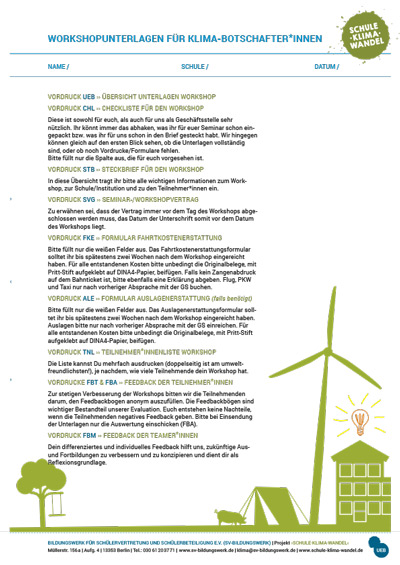 Wenn du Klima-Botschafter*in bist, kannst du hier die für deinen Workshop notwendigen Unterlagen wie Teilnehmenden-Liste, Fahrtkostenabrechnung, Feedbackformulare, Dokumentationsvorlage etc. runterladen.